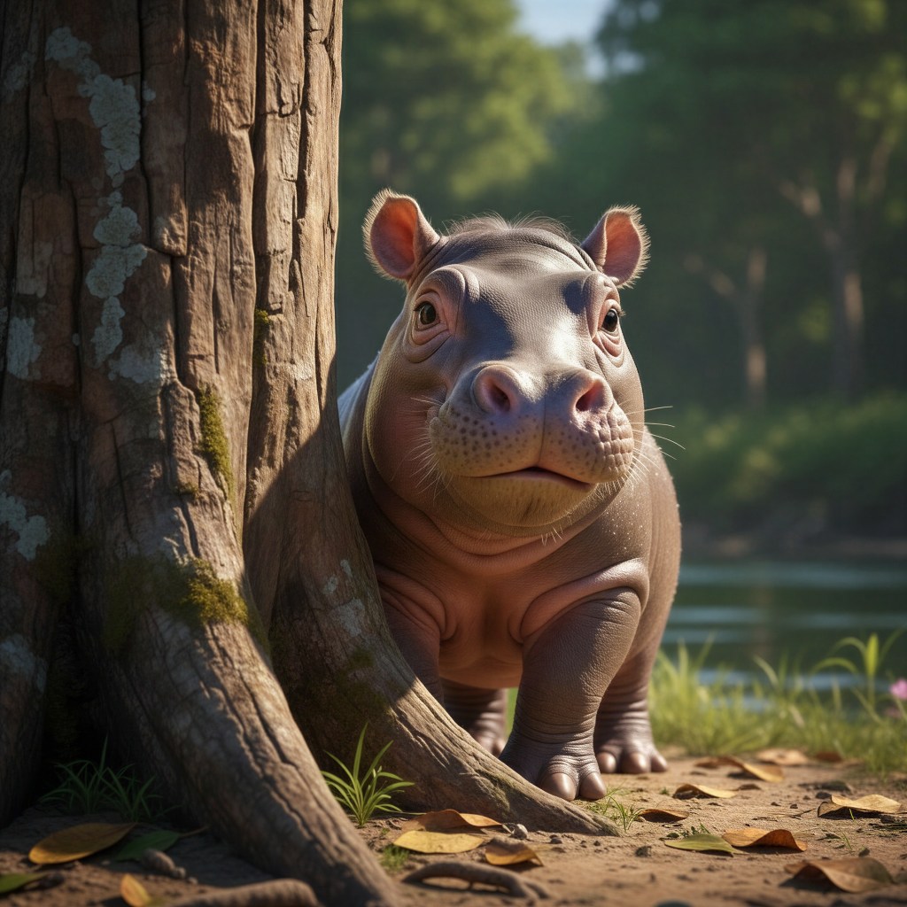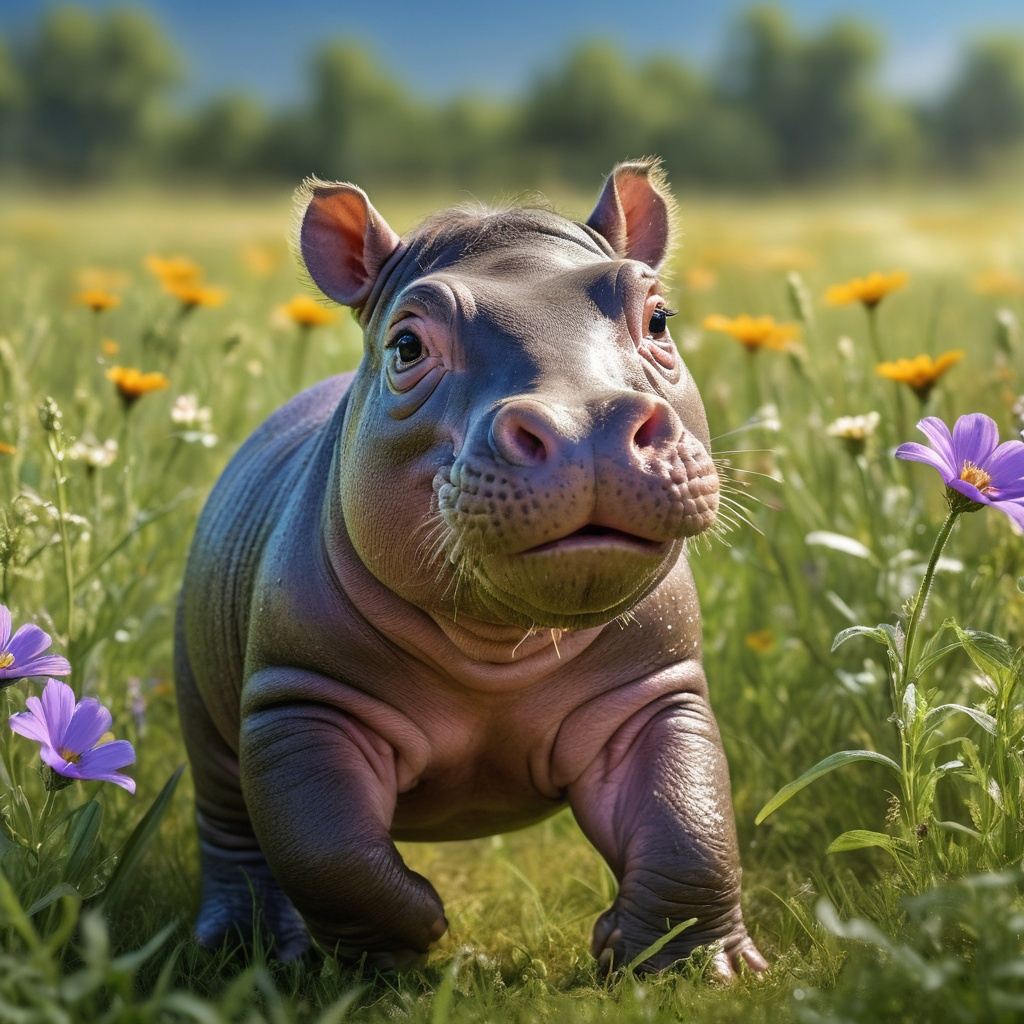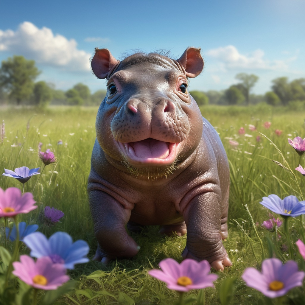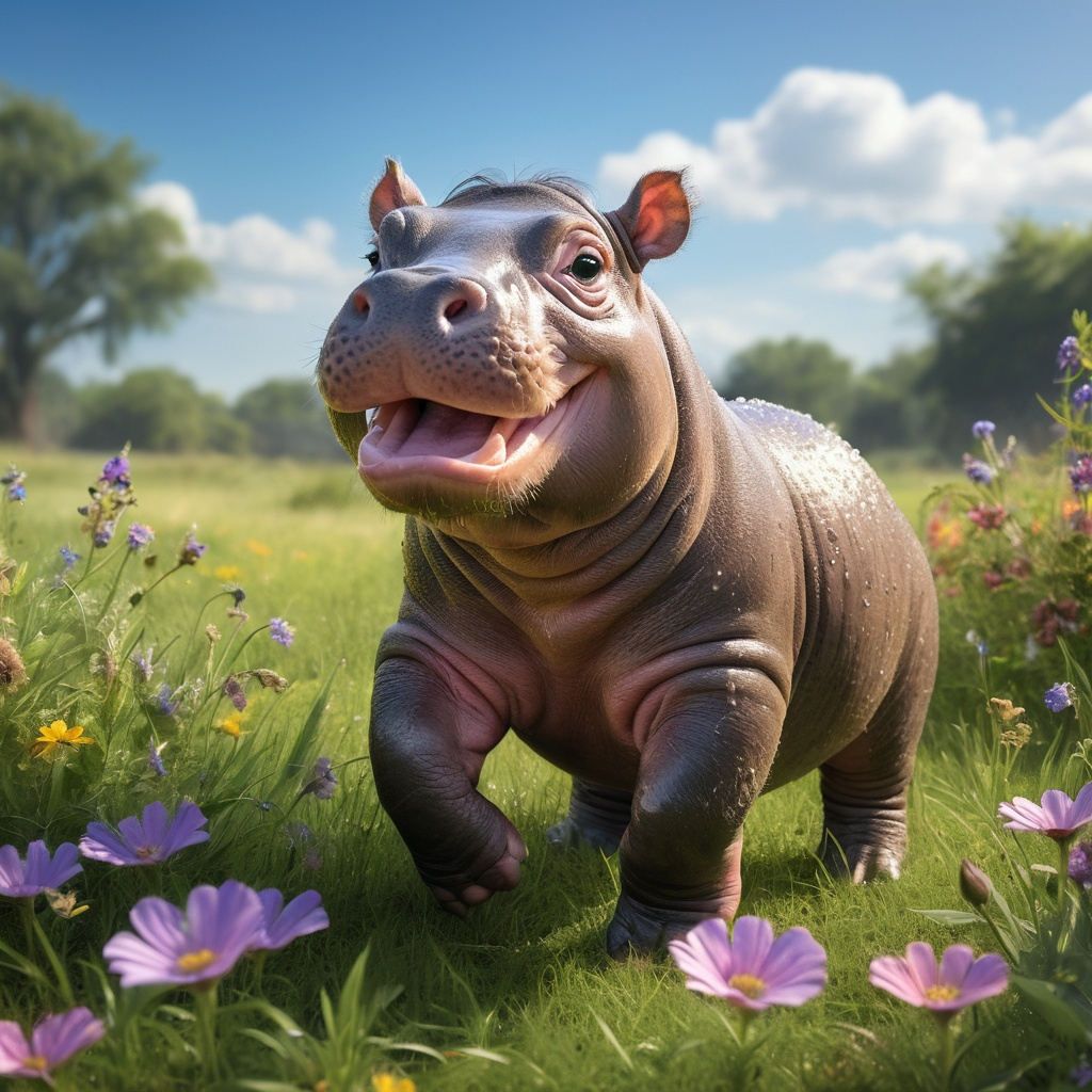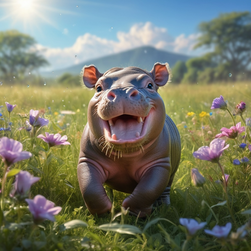 A photorealistic image of a baby hippopotamus joyfully playing in a sun-drenched meadow, surrounded by vibrant wildflowers swaying gently in the breeze. The lush green grass glistens with dew drops, catching the soft, warm sunlight that filters through a few wispy clouds in the azure sky. The baby hippo, with its round, cherubic face and big, glistening eyes, frolics playfully, splashing water as it leaps into a small, shimmering puddle. Its skin glistens with a hint of mud, adding a touch of earthy charm to its playful antics. In the background, a gentle stream sparkles, reflecting the peaceful atmosphere of this idyllic setting. This photorealistic scene captures the essence of childhood joy in nature, filled with colors and a warmth that embodies happiness.