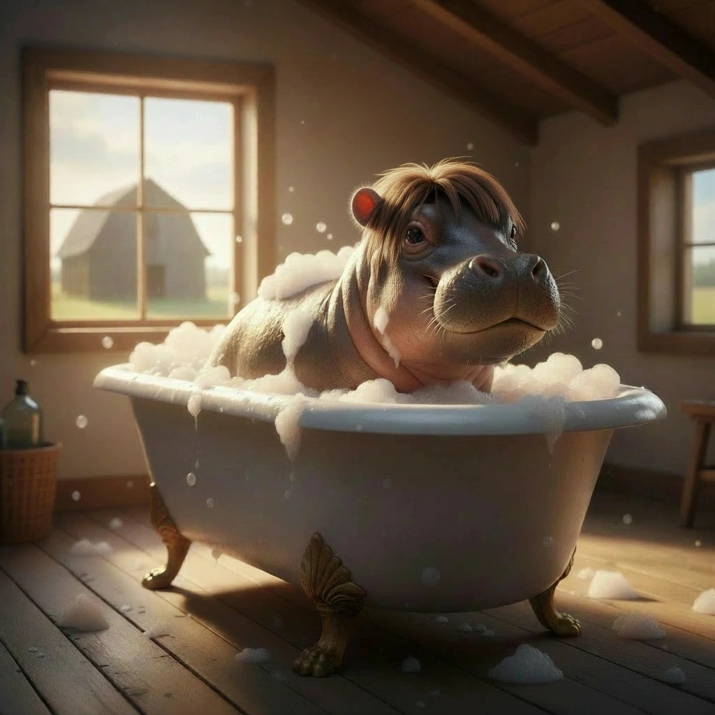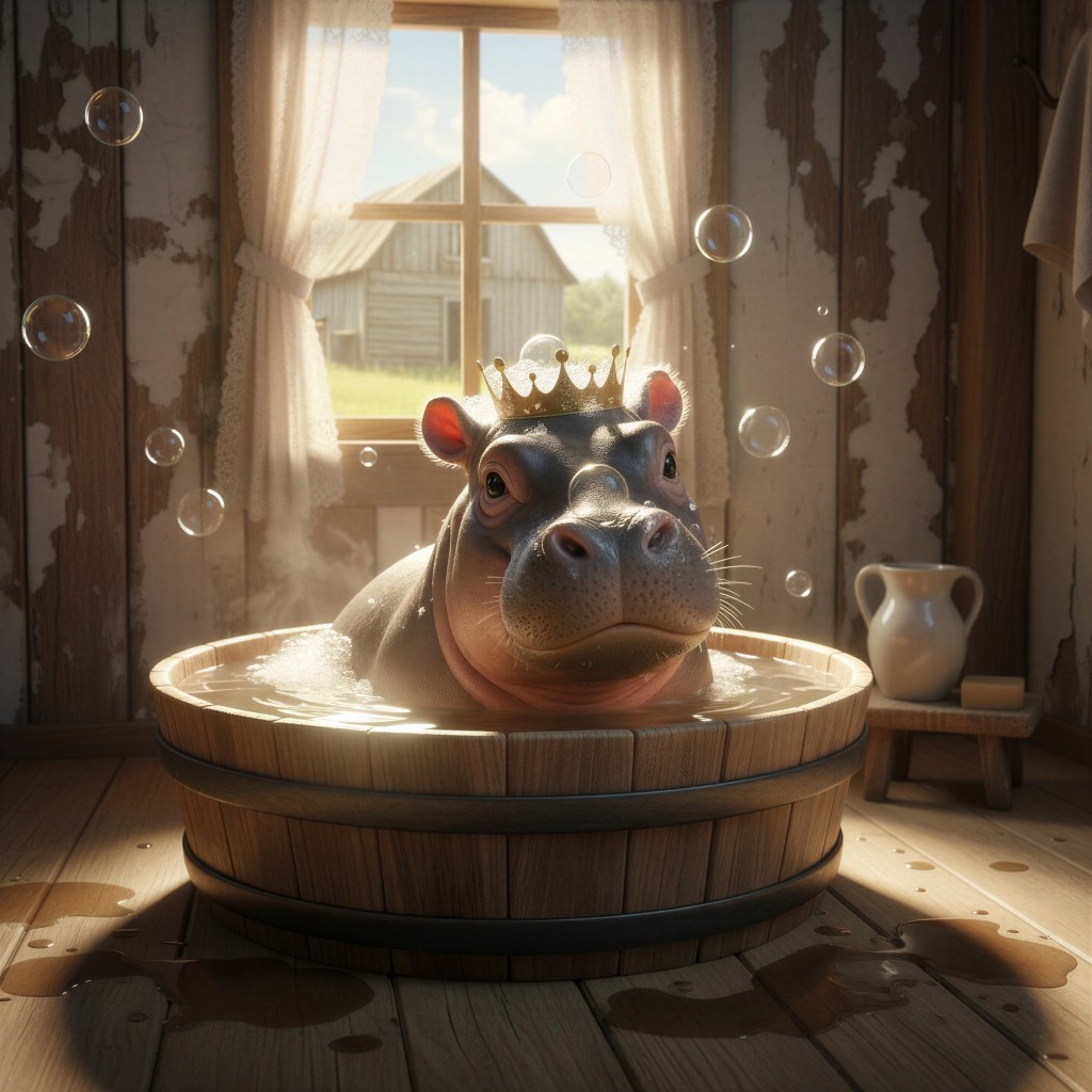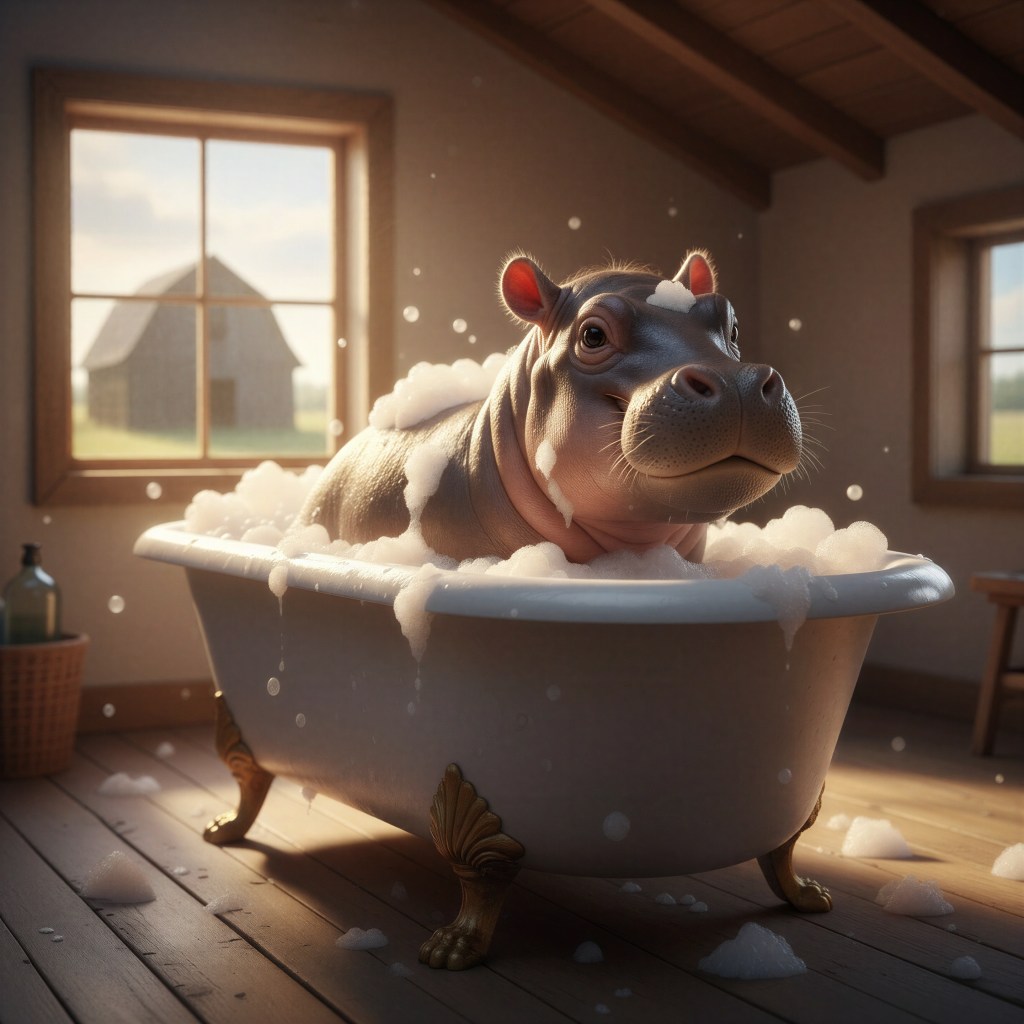 Anyway, throughout this whole creation process, Norbert did fairly well, and only had to remove an object from one of the images. For some reason, the ai thought a hippo should wear a crown on their head. I’ve no earthly idea where a crown was mentioned in my query…