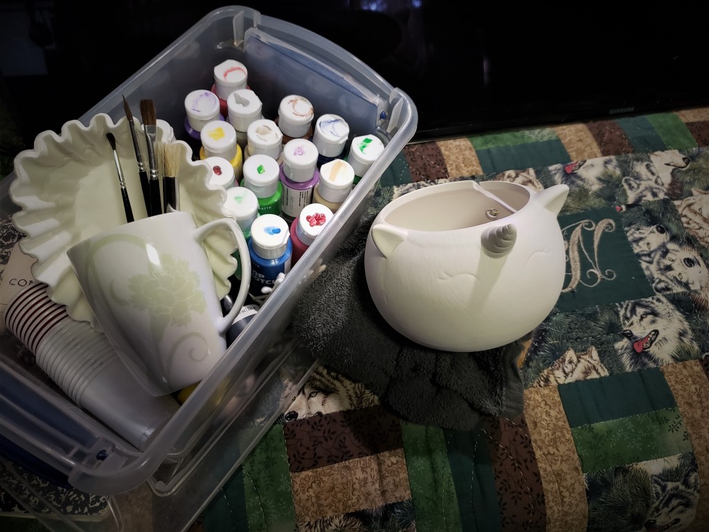 I discovered a love for painting from my sister in law. She showed me how to dry brush onto pottery, and we spent many hours together, with our projects before us, watching old black and white movies. I have been hooked on it ever since! I must say that one of the things I love about her, is her organization when it comes to crafting supplies. I think she’ll be proud when she sees this picture.