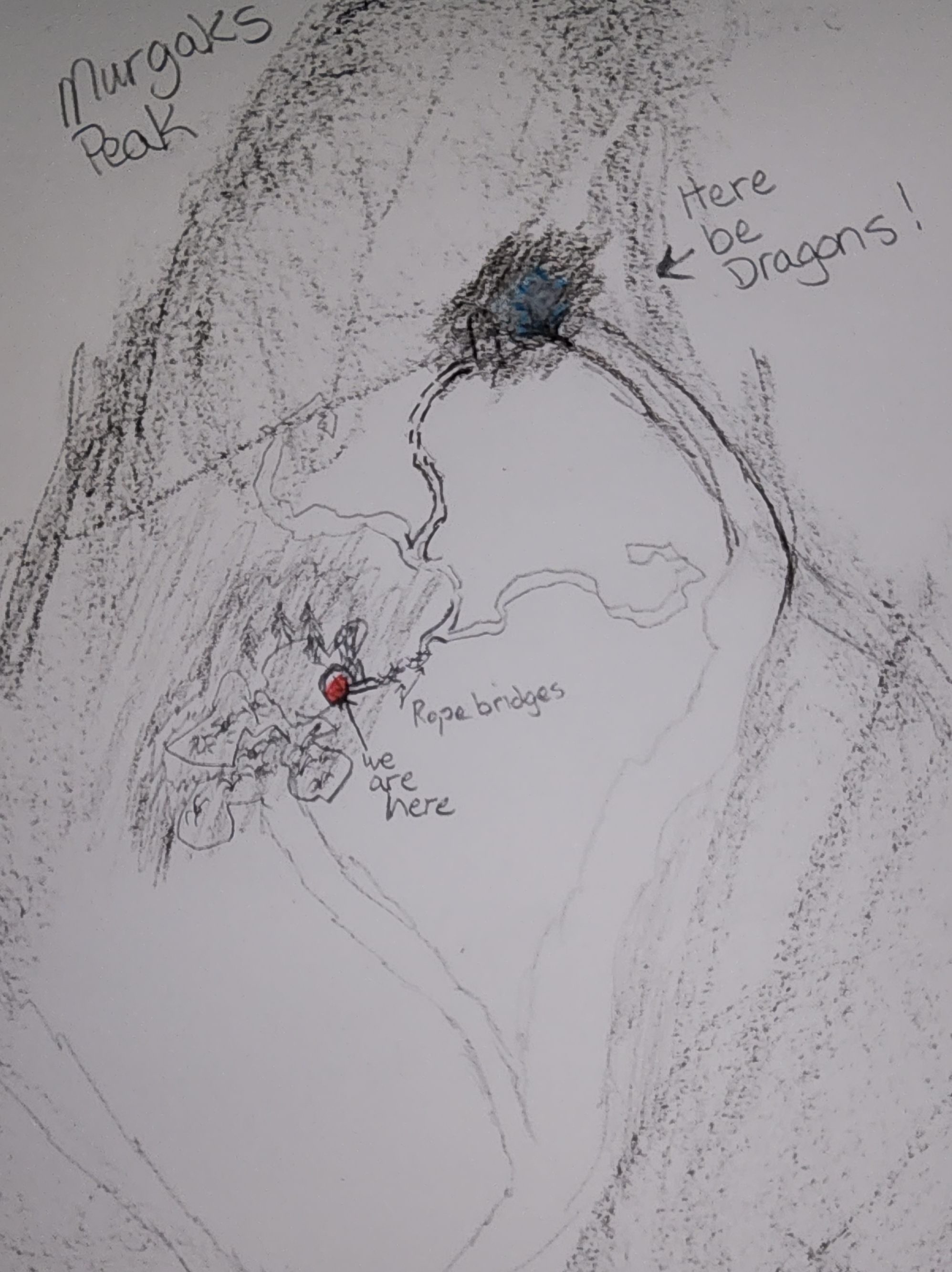 According to this map, there is a path that will lead up through the mountain, carrying us to a hidden doorway. This is an old and seemingly forgotten back entrance into the lair of a Nasty dragon. There is little that I know of him, other than the cryptic information I gathered from some archives. The dragon’s name is Porphyrios, and according to my readings, he is referred to as a Brass Dragon. Legend has it that these dragons were both outgoing and selfish, with a tendency for causing strife. Porphyrios lives his family’s likeness, to an extreme and then some, and has been terrorizing the lowlands for some time now.