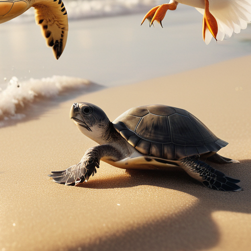 When this turtle’s mother had arrived to lay her eggs, the beach had been overcrowded with other turtles, already on their way back to the water; their nests were already safely buried throughout the area. As she considered where to safely deposit her eggs, hoping to do her duty and then catch up with the rest of her kind, the young turtle mother was approached by several local Gulls. When they suggested she lay her eggs further inland, she thought this a lucky break, as there seemed to be nowhere left, here on the beach.