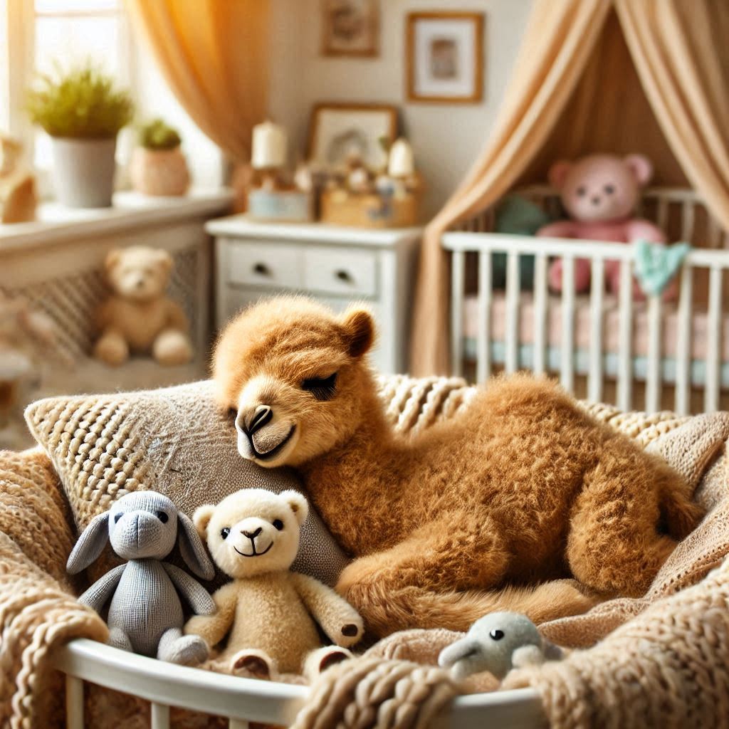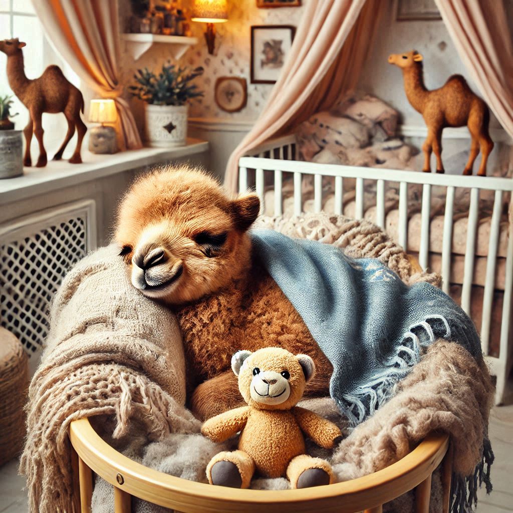 However, it does seem rather odd to find toy camels in the crib, but the actual baby is plopped down into some sort of clothing hamper, lol!