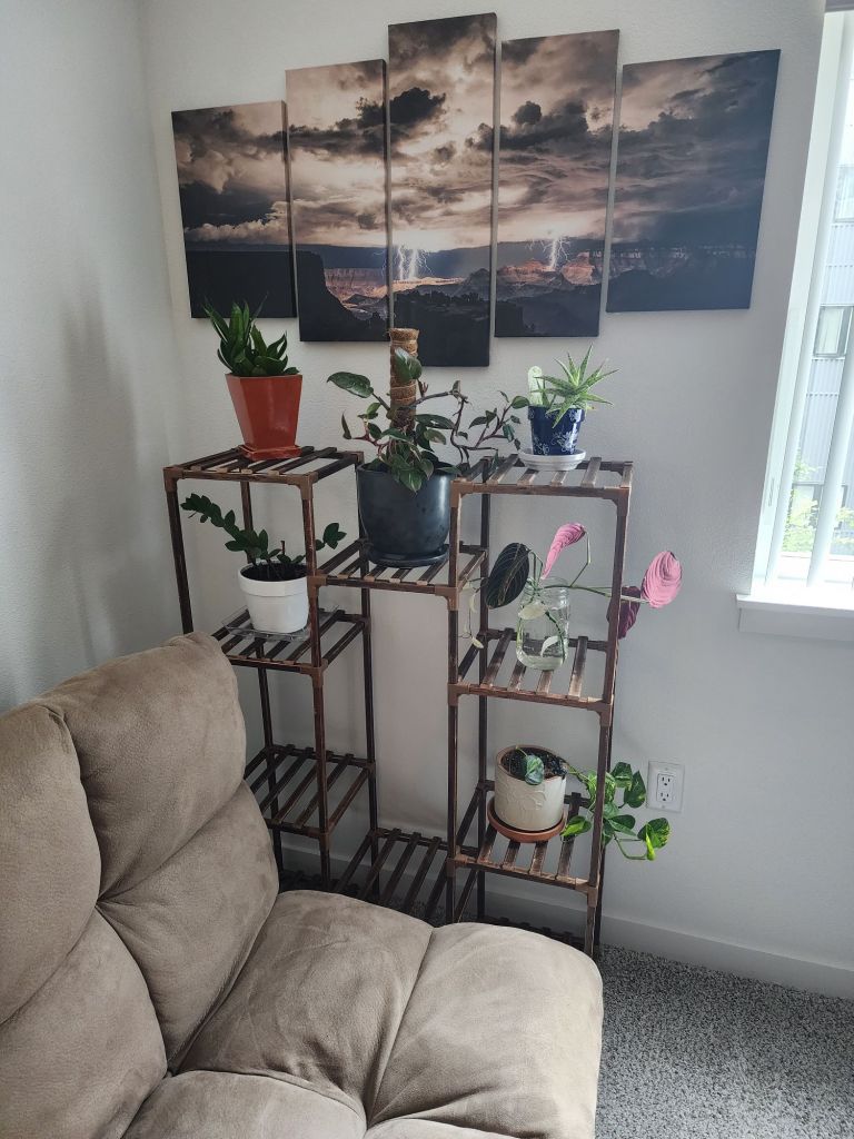I put together this plant shelving that my daughter and son-in-law got me for Mother’s Day. I love it! Now I’ve room for all the other plants that I need to get potted. That’s for another day though, as I don’t have any soil or pots, yet. If I did? I wouldn’t have gotten anything else done. Why? Because I am really loving all these plants!