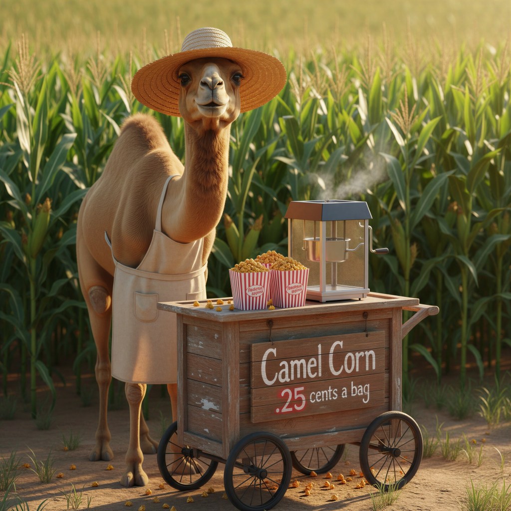 Eustace is so proud of his corn crop that he’s already set up a popcorn stand to sell his wares. I tried to tell him that the corn hasn’t been harvested yet, nor is it ready to be picked, but he was just too excited.