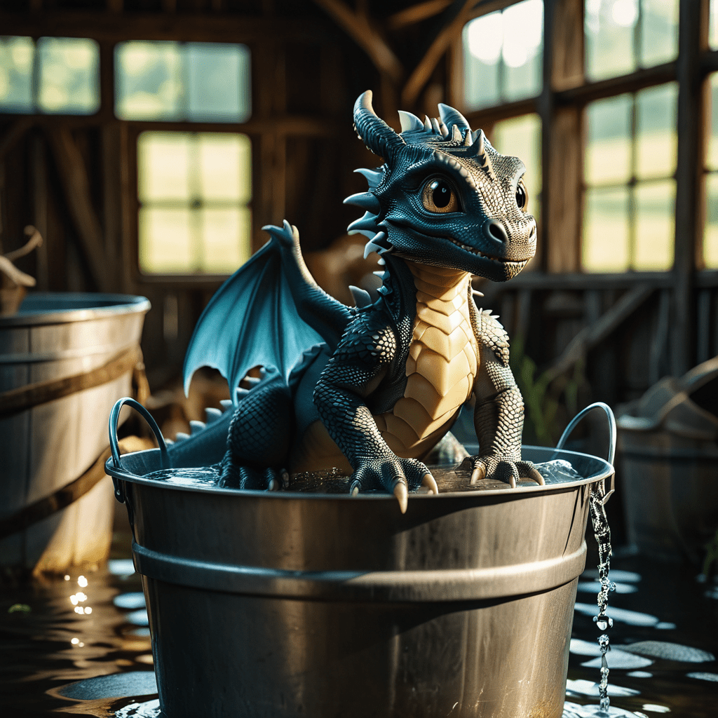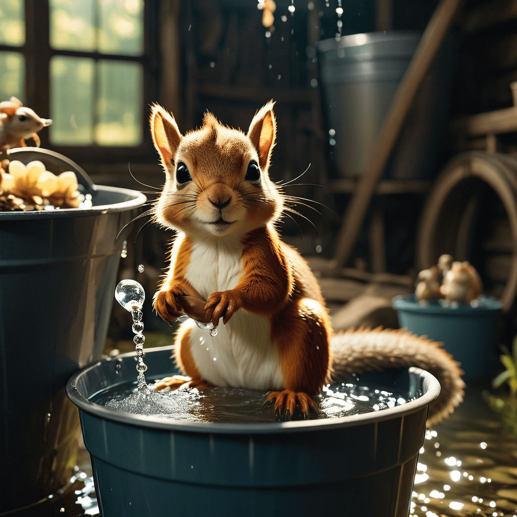 I turned back around to look inside the barn once more, only to see Squagon in the middle of the room atop another water-filled bucket. There was water pouring at a steady pace, from a hose that had been strategically placed in the rafters near the back of the barn. The tiny creature seemed like he’d just finished an energy drink, from the fierce half-crazed look in his eyes, along with twitching ears and vibrating whiskers! His bucket had been so full of water that even after I’d opened the door and allowed most of lake to escape, Squagon still sat perched upon his waterlogged craft!