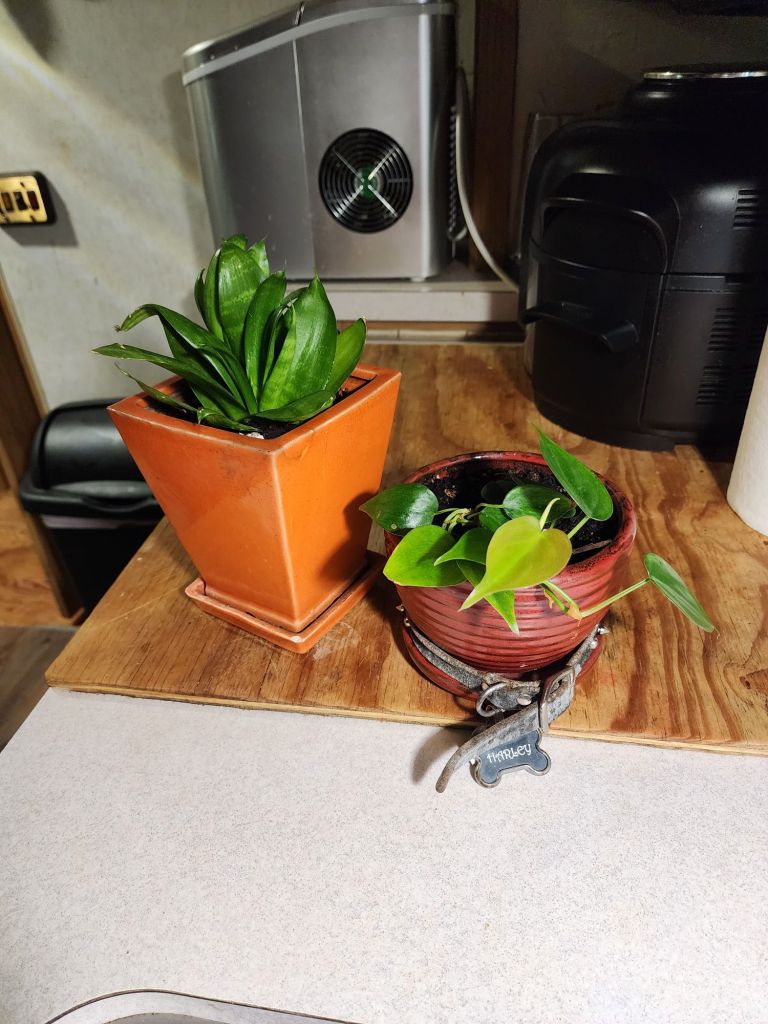 The plant on the left is apparently called a Snake plant, so I dubbed her Medusa! When the plant on the right came to live with us, I affectionately named her Sis, after one of my granddaughters… the tenacious one!