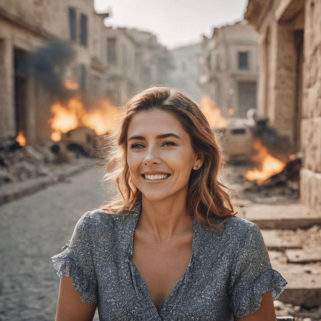 If you look behind the woman smiling, at the warzone that seems to surround her, one might think it odd that she seems to be happy.